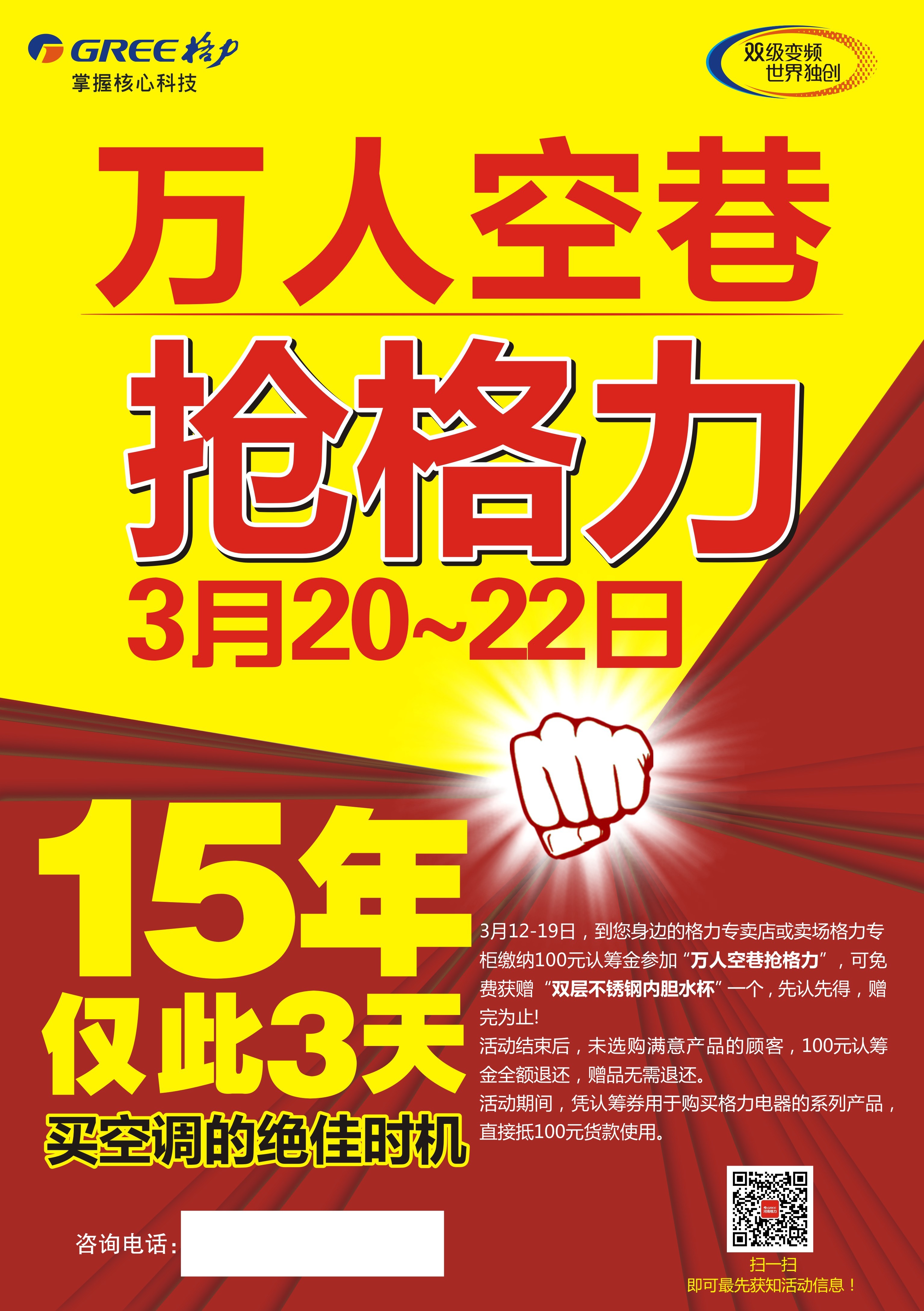 关注格力!15年无法逾越的空调盛宴!3月20—3月22日!万人空巷抢格力!不用找关系、不用找领导、不用找熟人,台台工程价,买空调的绝佳时机,就在万人空巷抢格力!格力掌握核心科技! 认筹热线:0372-3651806